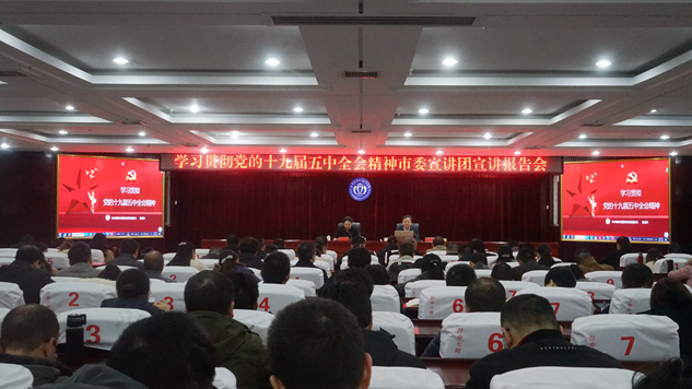 本网讯 12月8日,市十九届五中全会精神宣讲团成员、市委党校常务副校长张茂丰到我校对党的十九届五中全会精神进行宣讲。校长廖晓燕主持宣讲会,学校全体副科级以上干部、总支(直属支部)委员、各支部委员(含附属医院)、思政教师共计180余人现场聆听了宣讲报告。