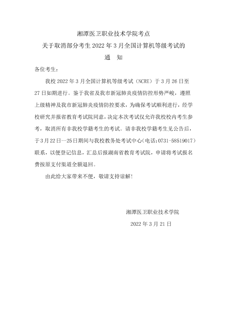湘潭医卫职业技术学院考点关于取消部分考生2022年3月全国计算机等级考试的通知